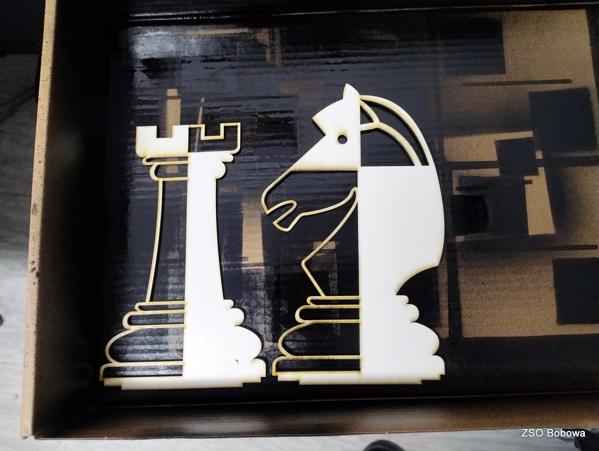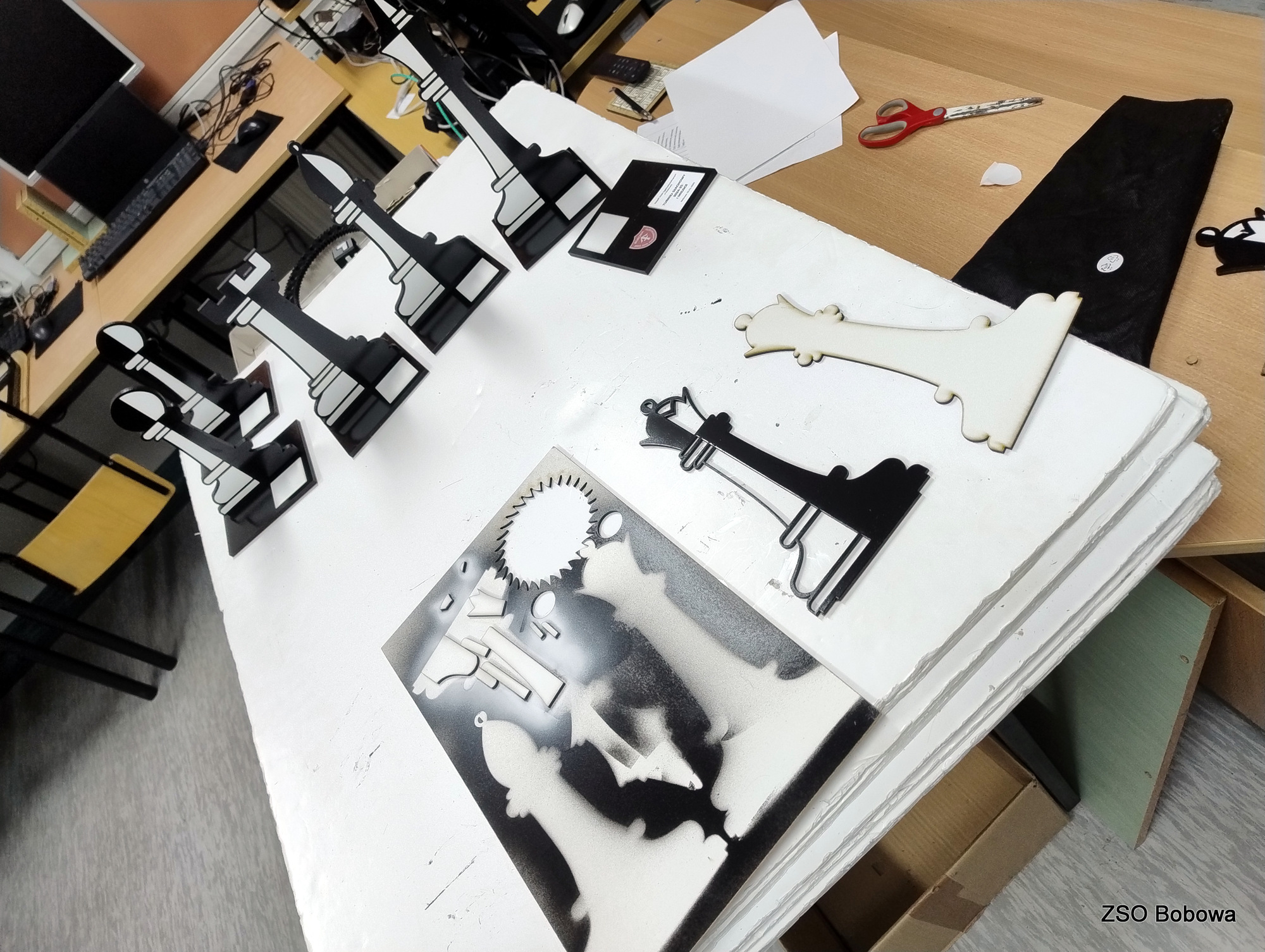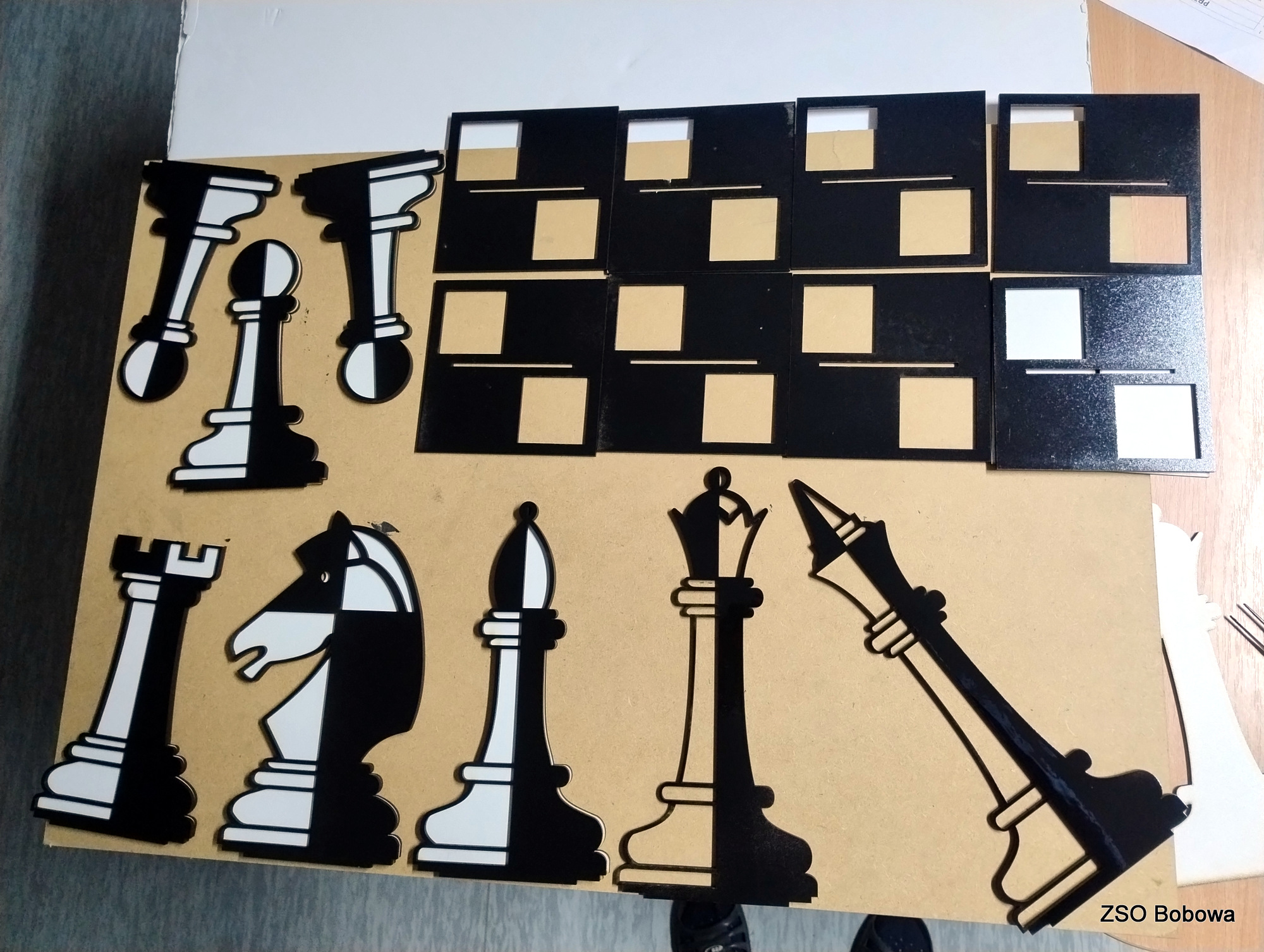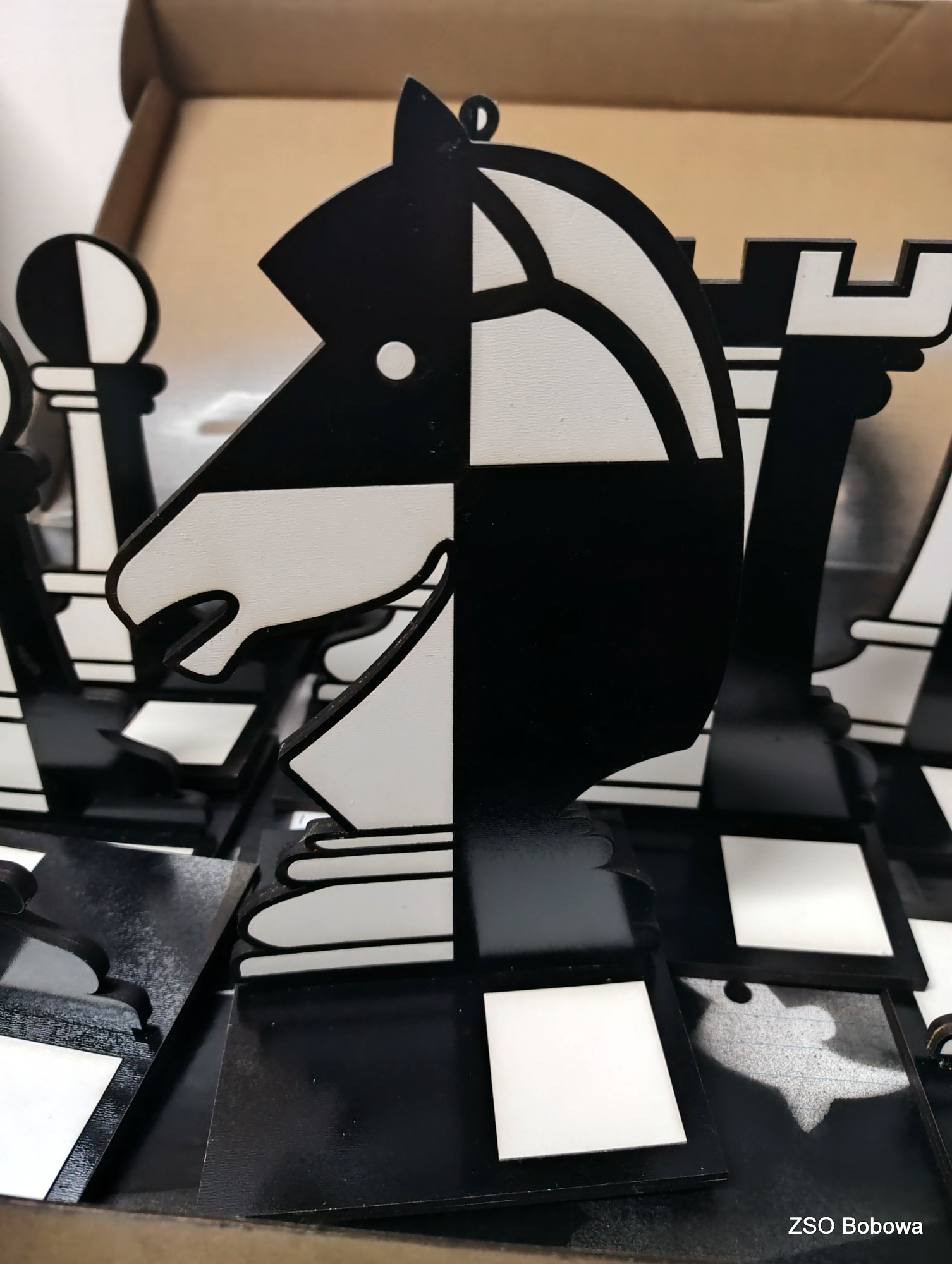 Obrazy figur szachowych skopiowano z przebogatych zasobów internetu. Projekt w grafice wektorowej SVG wykonano w programie Inkscape. Każda statuetka składa się z kilkunastu części, z których wycięciem w sklejce o grubości 3mm, bez problemu poradził sobie program LaserGRBL obsługujący laserowy ploter. Poszczególne elementy zostały polakierowane dwoma kolorami, a następnie sklejone. Gotowe figury zostały zamocowane w podstawkach.