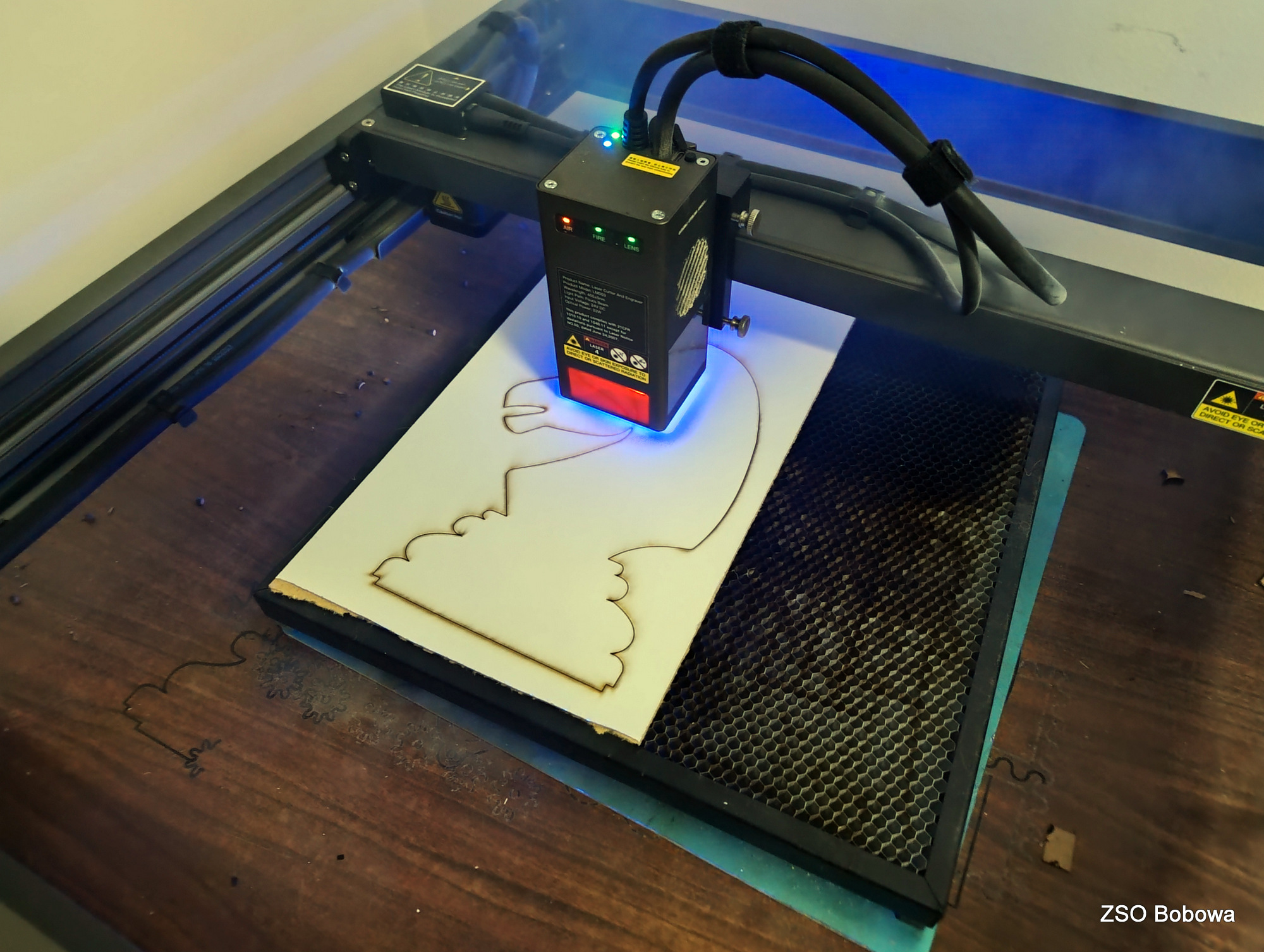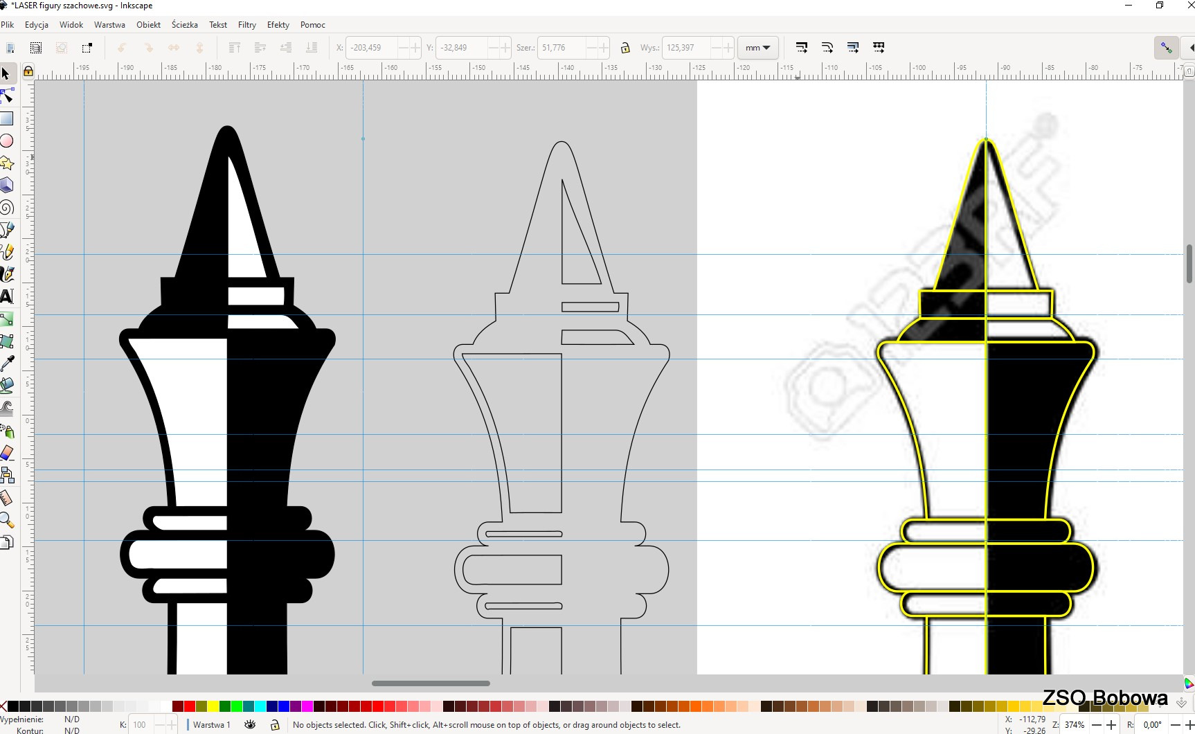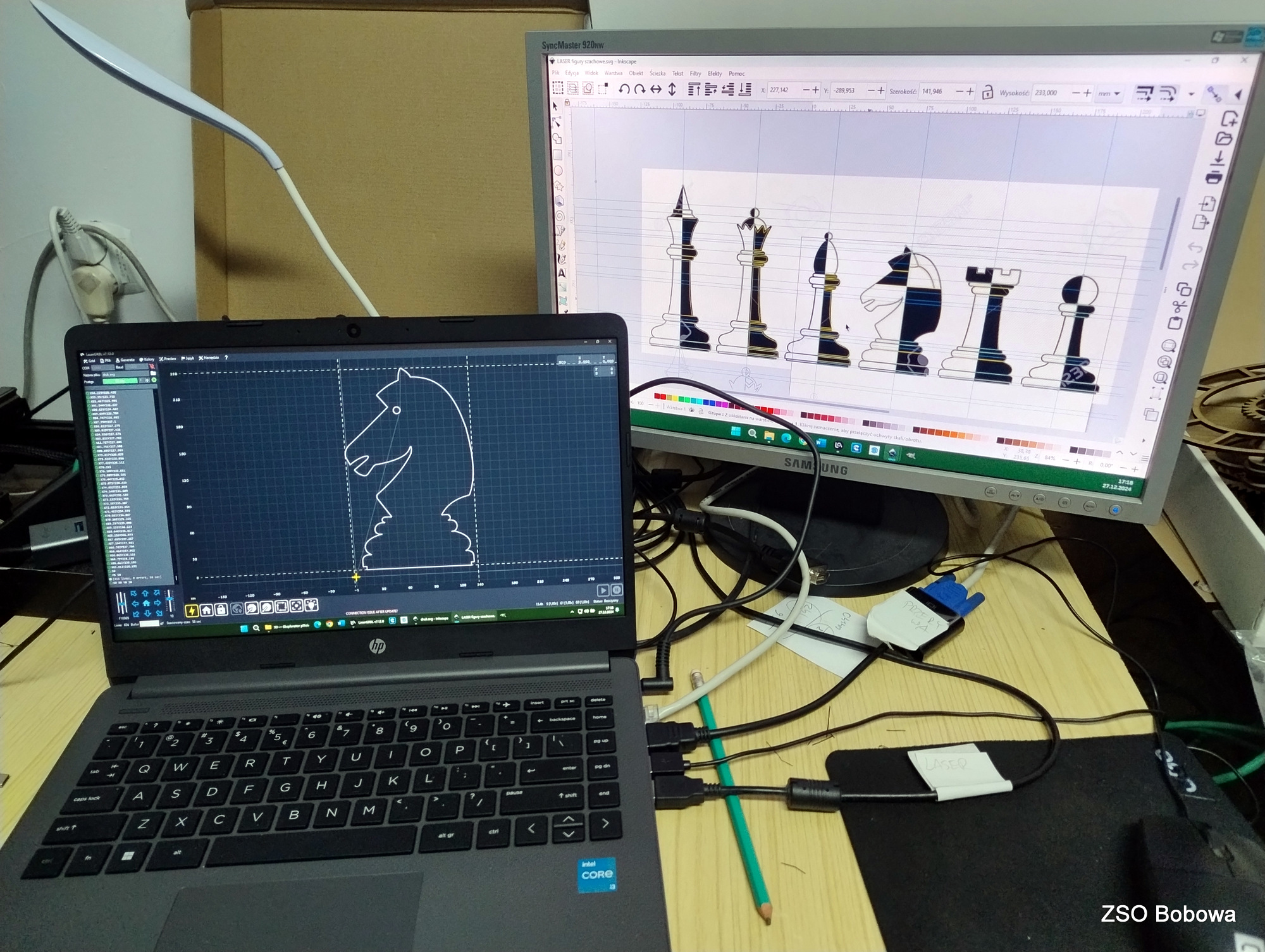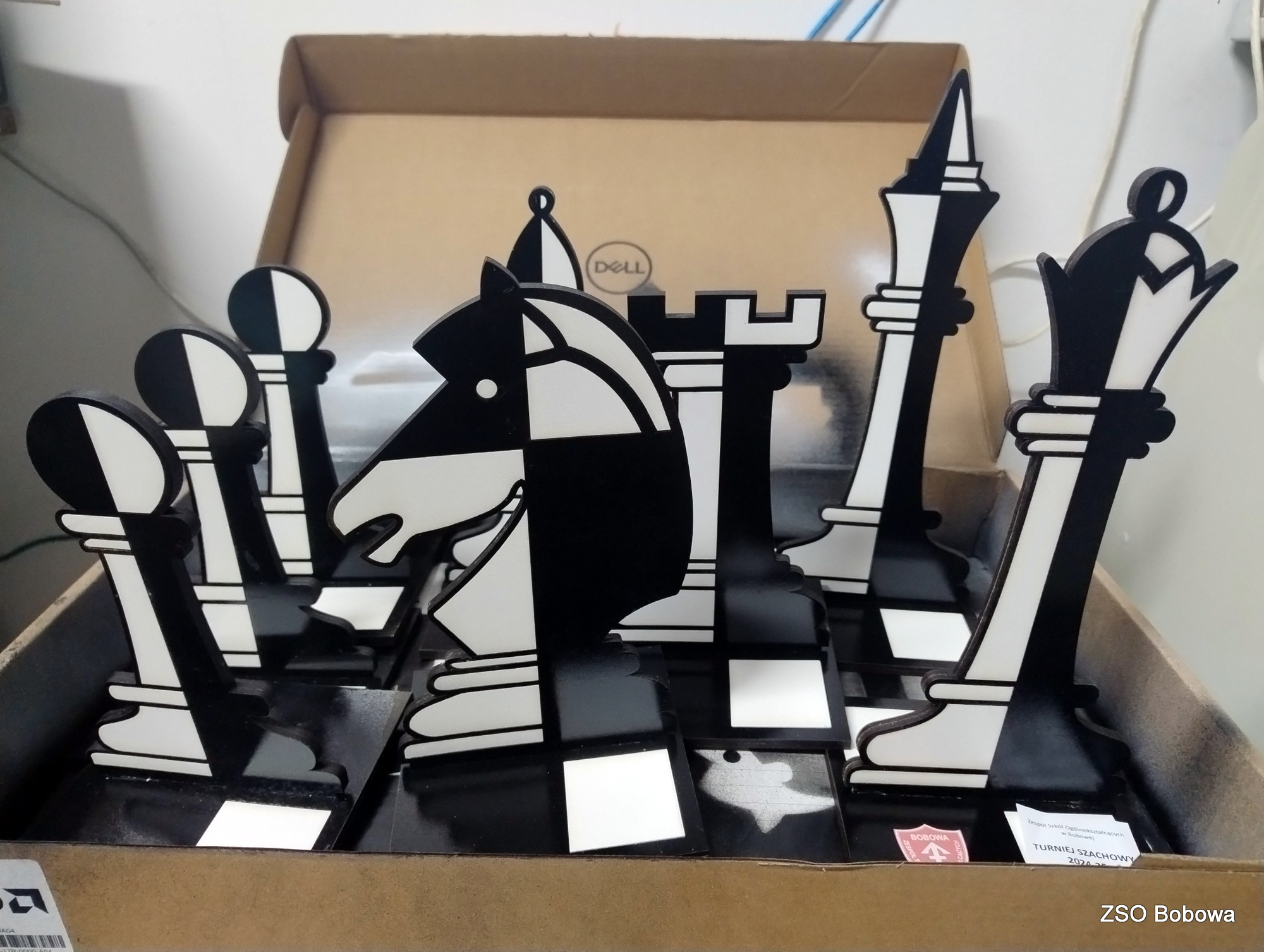 Obrazy figur szachowych skopiowano z przebogatych zasobów internetu. Projekt w grafice wektorowej SVG wykonano w programie Inkscape. Każda statuetka składa się z kilkunastu części, z których wycięciem w sklejce o grubości 3mm, bez problemu poradził sobie program LaserGRBL obsługujący laserowy ploter. Poszczególne elementy zostały polakierowane dwoma kolorami, a następnie sklejone. Gotowe figury zostały zamocowane w podstawkach.